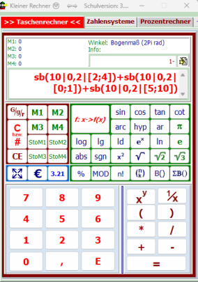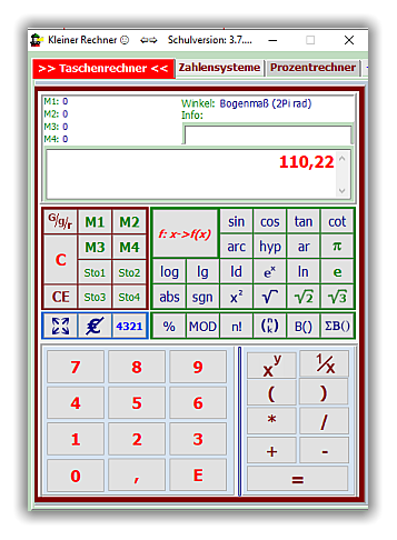 Der nicht kommerziell entwickelte (kostenlose) Schulrechner ist sowohl für allgemeine Rechenoperationen, hier wäre z. B. auch die klassische Addiermaschine mit Addierstreifen zu nennen, als auch für mathe- matische und technische Analysen incl. der Erstellung von Werte- tabellen usw., konzipiert worden. Alle Rechenoperationen im Modus “Taschenrechner“, kaufmännischer oder technischer Art, werden druck- und speicherbar protokolliert. Durch seine einfachen und intuitiven Formeleingaben, auch mittels „copy and paste“, soll der Rechner ebenfalls dem mathematischen Verständnis hinsichtlich Funktionen, Ablei- tungen, Integration, Reihenentwicklungen, Kurvenformen, Oberwellen, Stochastik, techni- schen Gesetzmäßigkeiten, komplexen Bauelementen usw. förderlich sein. Insbesondere die Abschnitte mit den ausführlichen Anwendungsbei- spielen (siehe Beispiele für Rechneranwendungen), die alle durch einfaches praktisches Nachvollziehen motivationsfördernd wirken können, sind hier zu benennen. Hierzu zählen auch die interaktiven und schnellen Visualisierungen von jeg- lichen reellen Funktionen, deren Ableitungen sowie die Flächendarstellungen der Ergebnisse bestimmter Integrale (“Bestimmtes Integral“). Durch die diesbezügliche große Flexibilität sowie die einfachen Modifizie- rungen der Problemstellungen können die mathematischen Spieltriebe angeregt werden, die zu vertiefenden experimentellen - sich dann aber auch erschließenden - Untersuchungen bzw. Analysen führen sollten. Explizit sei hier auch auf den Beispielbereich 5 hingewiesen, der dem Themenbereich "Komplexe Bauelemente - Schaltungen" gewidmet ist. Hier werden u. a. Kennlinien, Übertragungsfunktionen und Phasengänge von sich nicht einfach erschließenden komplexen (passiven) Filterschaltungen wie Hochpass, Tiefpass, Bandsperre, Bandpass usw. erstellt. Durch Modifizierungen mittels verwendeter Parameter können (spielerisch) experimentelle Analysen initiiert werden, die eine theoretische Durchdringung der komplexen Zusammenhänge ermöglicht. Anmerkungen: Die Formellängen sind praktisch unbegrenzt (Beispiele Sammlung 2; Formellänge > 9400 Zeichen). Die Argumente der Funktionen können selbst wieder aus Funktionen bestehen. Verletzungen einzelner Definitionsbereiche, z. B. bei Plot- ausgaben usw., führen nicht zum Abbruch. Die Schachtelungstiefen der Formeln sind ebenfalls nicht begrenzt! Hinweis zum Namen "Kleiner Rechner": Das Projekt begann - wie eigentlich üblich - mit einem kleinen Pflichtenheft und dementsprechend mit dem sich erschließenden Projektnamen „Kleiner Rechner“. Obwohl das Projekt im Laufe der Zeit permanent erweitert wurde (siehe "Leistungen - Übersicht"), ist der mittlerweile irreführende Projektname nie geändert worden. Heute besteht das Programm aus dem mächtigen Hauptteil „Taschenrechner“ und den oben in der Menüleiste zu sehenden weiteren eigenständigen Teilprogrammen und Utilities. Der Hauptab- schnitt "Taschenrechner" selbst besteht aus den beiden Programmbereichen „Klassischer Taschenrechner“ und „Funktionenrechner“. (Hinweis: Die blauen Pfeile sind verlinkt) Taschenrechner: Funktioneneingaben für Ableitungen, Integration, Plotausgaben und Listen- generierungen Differenzieren: Ableitungen bis einschließlich der dritten Ableitung, Kurvendiskussion usw. Integrieren: Mathem. und Flächenintegrale zwischen Abszisse und Kurve sowie zwischen zwei Kurven. Volumen- und Flächenberechnung von Rotationskörpern Plotausgaben: Funktionen, Ableitungen, Integrale Listen bzw. Tabellen erstellen Funktionenbeschreibungen, Definitionen, Syntax, Fehlermeldungen Leistungen - Übersicht ⇔ Entwicklungsabschnitte - Interessante mehrfach geschachtelte komplexe Gesamtformel als Kopiervorlage - Umgang mit extrem großen Zahlen die außerhalb der Vorstellungskraft liegen - Einfache Fehlerkorrektur einer Kolonnenaddition durch „copy and paste“ - Berechnungen einzelner Koeffizienten eines Binoms vom Grade n - Binomialverteilung - Bernoulli-Formel - Zusammensetzung von Rechteckschwingungen durch Oberwellen - Zusammensetzung von Sägezahnschwingungen durch Oberwellen - Zusammensetzung von Dreiecksschwingungen durch Oberwellen - Eingabe und Berechnung einer Formel mit mehr als 9400 (7700 ohne Leerzeichen) Zeichen - Exemplarische Listenausgabe der Koeffizienten eines Binoms 50. Grades - Experimentieren mit unterschiedlichen Dichtefunktionen - Glockenkurven - Integration von unterschiedlichen Dichtefunktionen - Glockenkurven - Exemplarische Berechnungen einiger Tabellenwerte der Standardnormal- verteilung - Rotationsvolumenberechnung - Das verblüffende Sektglasproblem - Rotationskörper: Volumen- und Manteloberflächenberechnungen - a. Berechnung Kühlturmvolumen - b. Berechnung Kühlturmmantelfläche - Manteloberlächenberechnungen - Rund um die Kugel - Volumen und Mantelflächenberechnungen einer Blumenvase incl. der Bewertung der Oberflächenextremwerte - Übersicht - komplexe Rechnung - Ideale und reale Kondensatoren und Spulen - Ideale und reale Reihenschwingkreise (Saugkreise) - Ideale und reale Parallelschwingkreise (Sperrkreise) - Gegenüberstellungen Reihen- und Parallelschwingkreise: - Spannungsüberhöhung am Reihenschwingkreis - RLC - Hoch- und Tiefpass - RLC - Bandsperre - RLC - Bandpass - Anwendung der Polarform beim Bandpass (Hinweis: Die Pfeile sind verlinkt) Konvertierung von Zahlen in unterschiedliche Zahlensysteme Die zugelassenen Werte für die Basen sind aus pragmatischen Gründen auf den Bereich B ∈ [ 2, 36 ] begrenzt. Prozentrechner Manchmal ganz praktisch. ASCII Code ASCII– und erweiterter ASCII-Zeichensatz incl. Steuerzeichen in Abhängigkeit der einzelnen Schriftfonts. Unicode Unicodezeichenausgabe in Tabellenform, Übernahme der interaktiven Zeichen (copy and paste), Blockausgabe von Unicodezeichen usw. Farblehre Additive u. subtraktive Farbmischungen, Farbräume, Farbumrechnungen, Vierfarbendruck CMYK, visuelle interaktive Darstellungen. Der „Kl