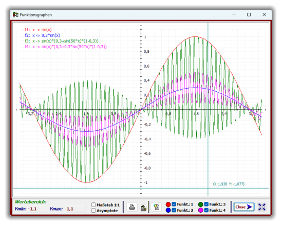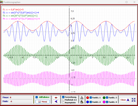 Programmbeschreibungen - Anleitungen - Anwendungsbeispiele Programmbeschreibungen - Anleitungen - Anwendungsbeispiele ** Amplitudenmodulation - Modulationsgrad: 0,8 u. 0,3 ** ** Übertragungsfunktionen - Bandpass ** ** Sinus - Impressionen **