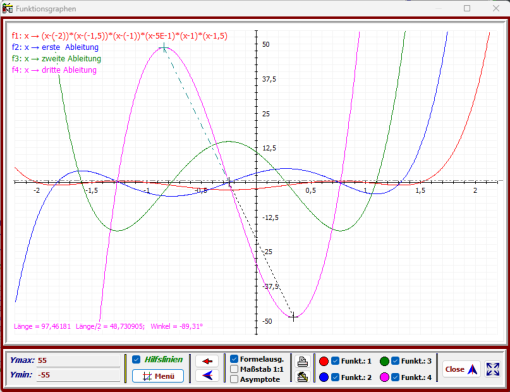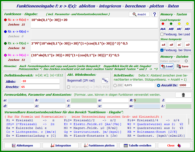 **  Eingabe für Funktionen (auch copy and paste), Parameter, Definitionsbereiche usw.  **Formellänge praktisch nicht begrenzt (mehr als 9000 Zeichen). ** Obers. - Untersumme ** **  Ableitungen: fn, fn', fn'', fn'''  **